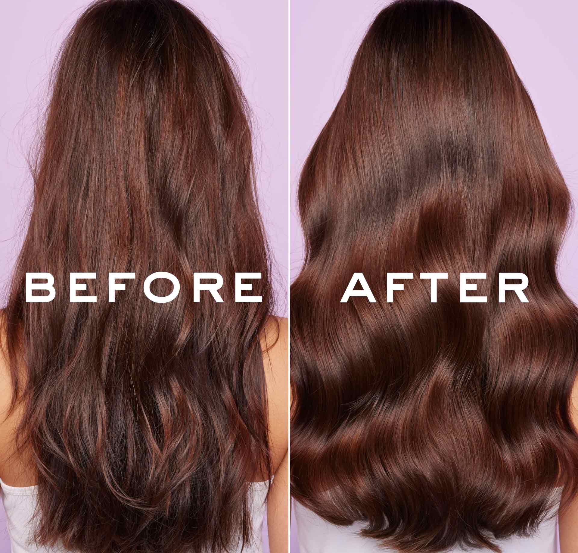 Before/after: Results after application of the High Shine Shampoo, Intensive Repair Hair Mask, Detangling Leave-In Hair Milk.