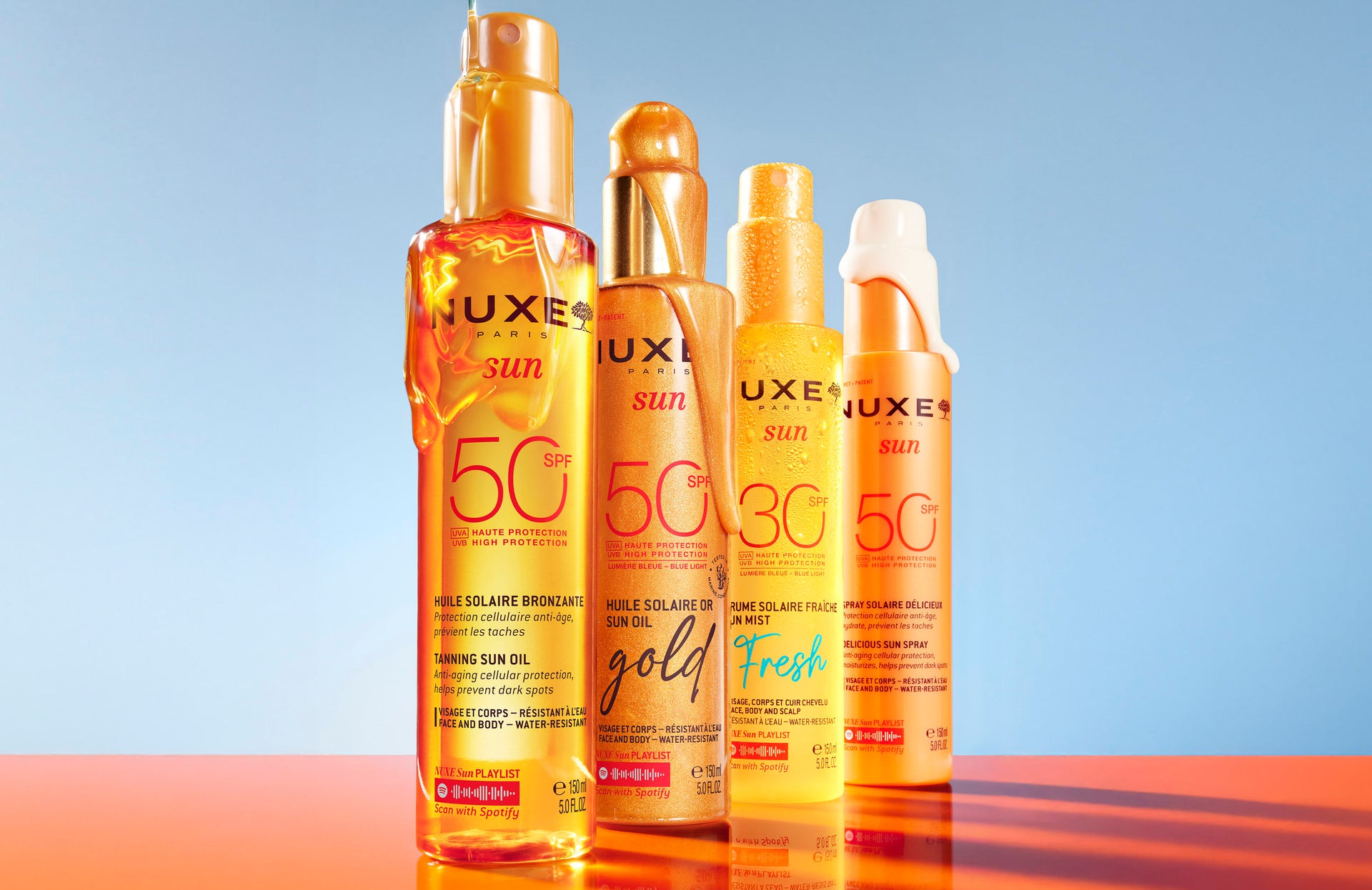 ⁽¹⁾ NUXE Sun protection products except for: Tanning Sun Oil SPF10, Tanning Sun Oil SPF30, Delicious Sun Spray SPF30, Melting Sun Lotion SPF30, Melting Sun Cream SPF30, Tanning Sun Oil SPF50, Delicious Sun Spray SPF50, Light Sun Fluid SPF50, Moisturizing Protective Milky Oil for Hair.