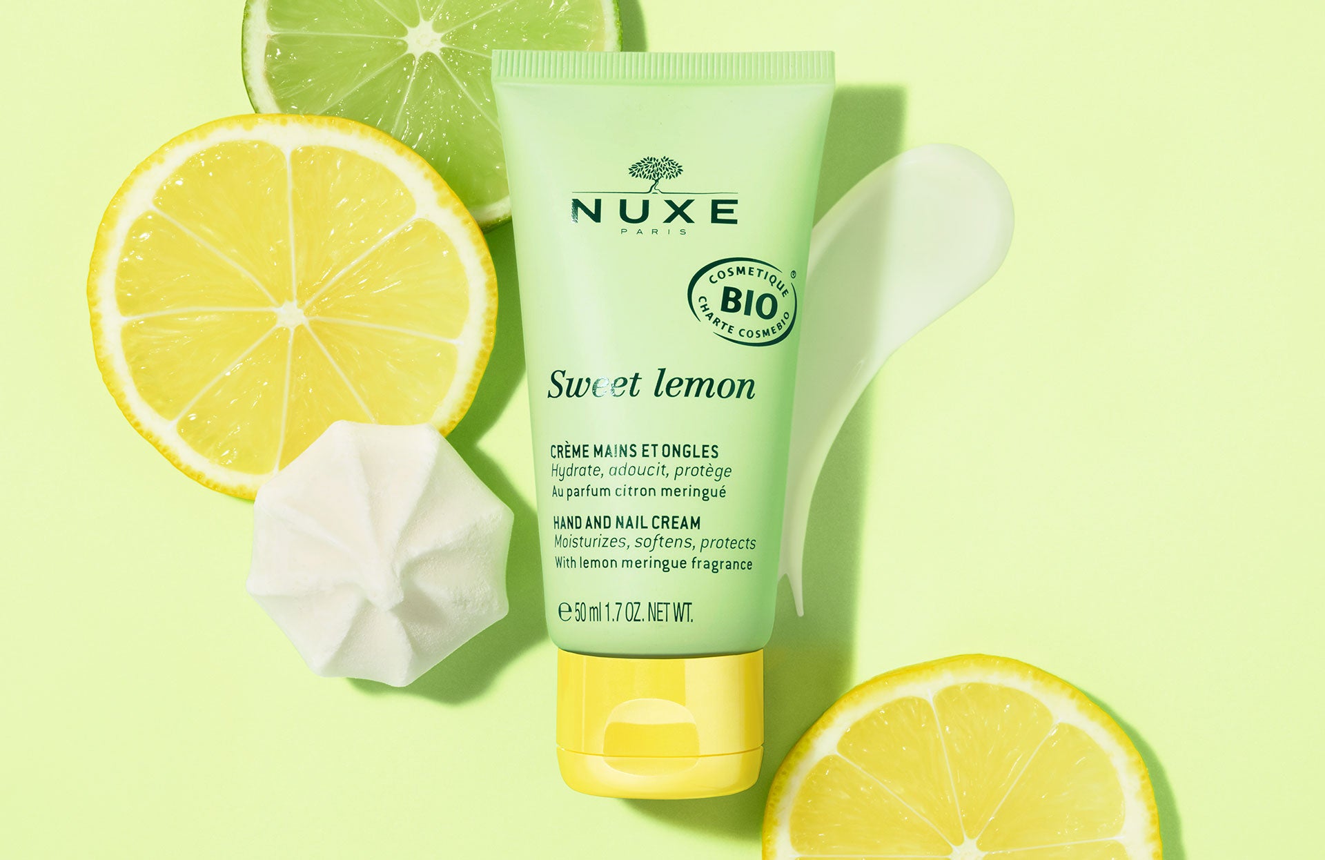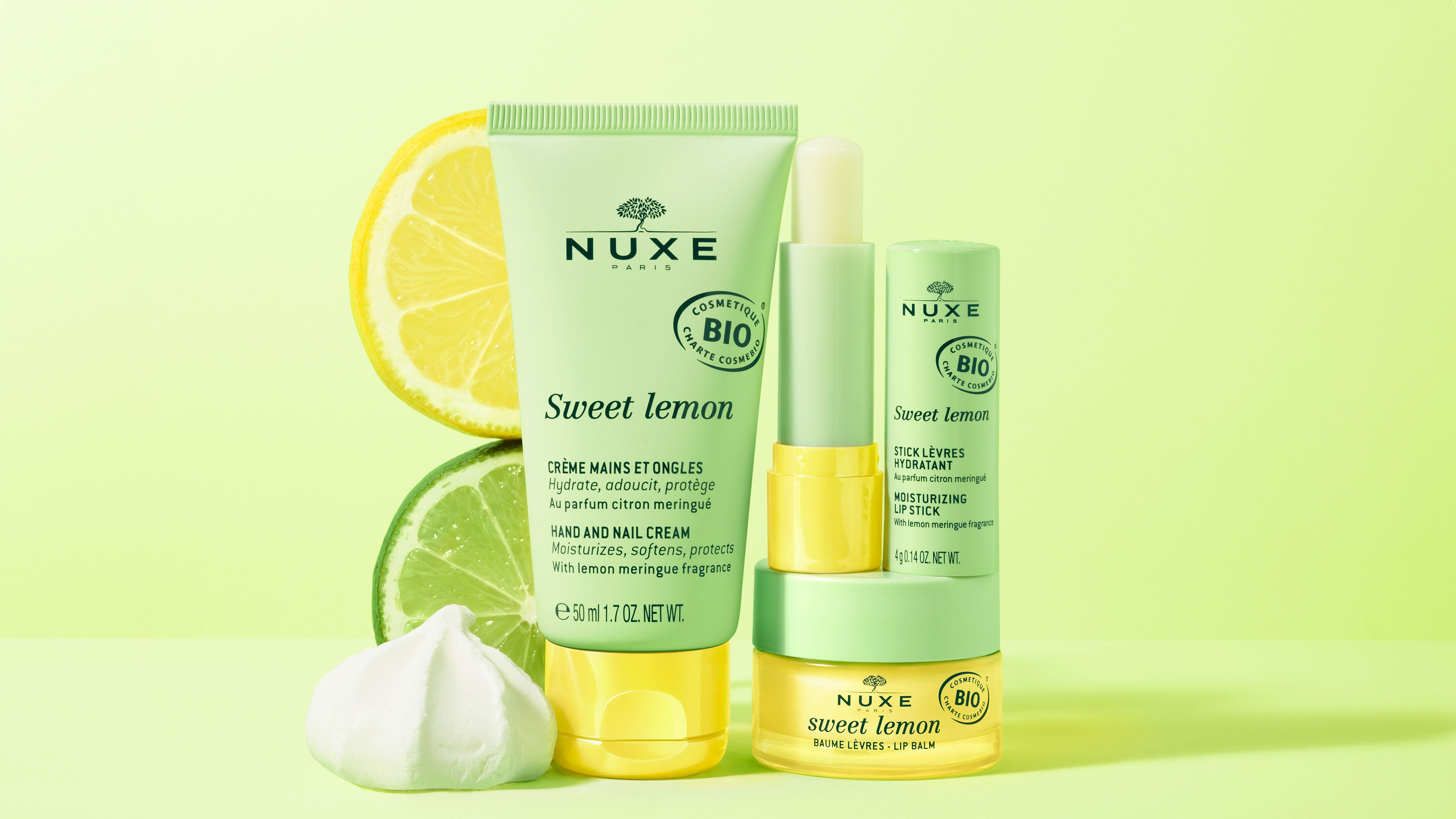 Add a delectable touch to your beauty routine with these vegan⁽¹⁾ and certified organic care products for the lips and hands with a luscious lemon-meringue scent. These two areas of the body are particularly exposed to external aggressions which means they tend to quickly feel dry. The Sweet Lemon care trio reveals formulas designed to moisturize and soften hands and lips, while providing a real moment of softness.