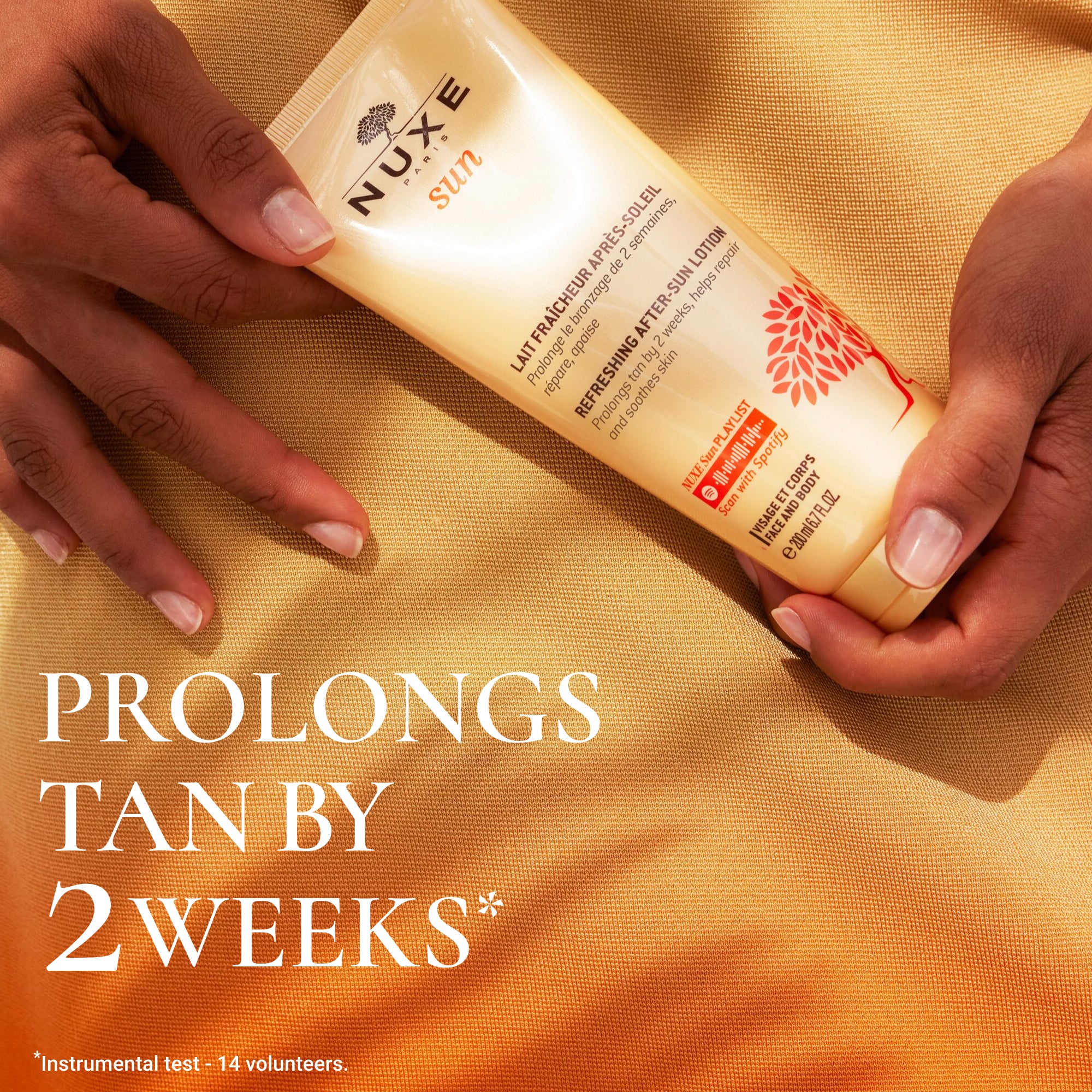 This After-Sun Lotion Face and Body is the secret for overheated skins after sun exposure. With its incredible freshness, your skin is soothed, repaired and lastingly moisturized. Its formula glows your tan and prolongs it for 2 weeks⁽¹⁾. Skin is immediately comforted for 90% of users⁽²⁾, and soothed for 98% of them⁽²⁾.