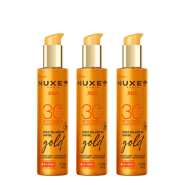 This Sun Oil Gold SPF30 Face and Body provides a broad spectrum protection from UVA/UVB and Blue Light thanks to an exclusive patented filtering system⁽¹⁾. It offers a reinforced anti-aging cellular protection through a twofold efficacy against UVA⁽²⁾. Water-resistant and non-comedogenic, it is suitable for all skin types.