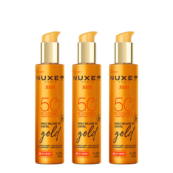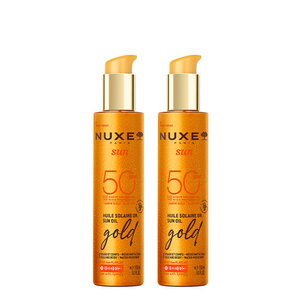 This Sun Oil Gold SPF50 Face and Body provides a broad spectrum protection from UVA/UVB and Blue Light thanks to an exclusive patented filtering system⁽¹⁾. It offers a reinforced anti-aging cellular protection⁽²⁾ and prevents the appearance of dark spots. Water-resistant and non-comedogenic, it is suitable for all skin types.